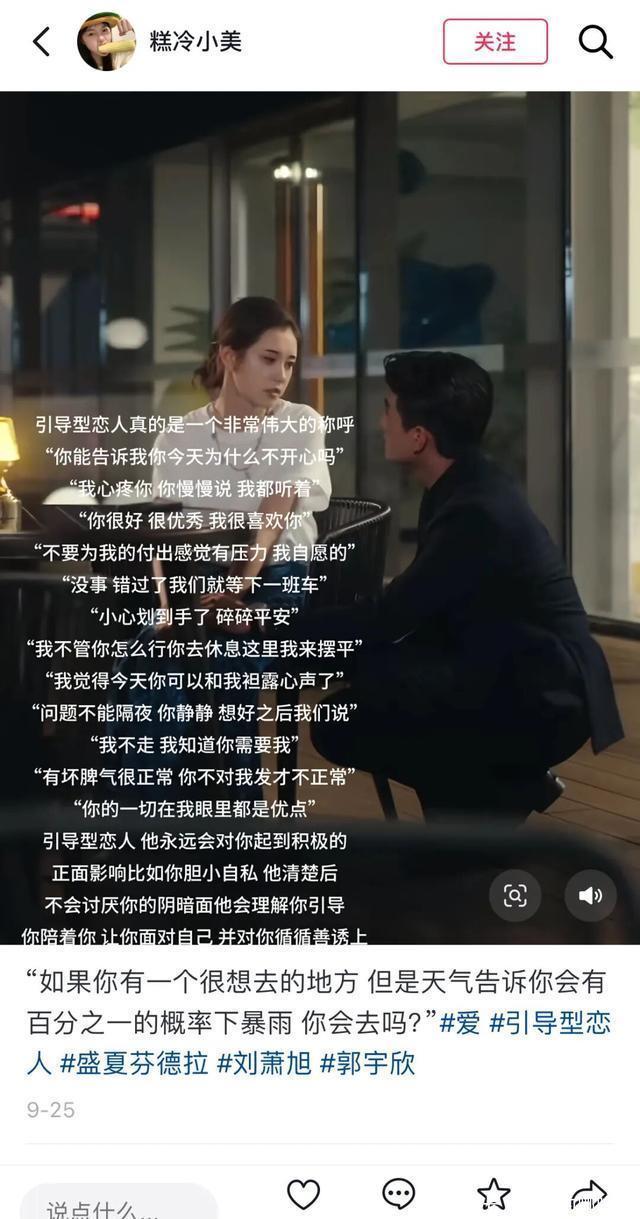 当然还有一点,《盛夏芬德拉》整部剧的美学追求也是克制高级的。文艺细腻取代感官刺激,前期打光取代后期滤镜,画面真实不廉价,在竖短中相对少见。男演员那两道法令纹被主创悉心保护、并未一磨了之,也成为受众眼里“质感”的一部分。 简而言之,放在短国,周晟安火在新鲜。但如果放在整个剧集市场,周晟安的身上其实有着许多昔日爆款人设的影子。除了硬糖君曾经讨论的“克己复礼中式总裁”(《新中式总裁启示录》),还有争议又长红的“爹系男友”,以及去年就被追捧过一段时间的“人夫感”。 《盛夏芬德拉》的爹系体现得很直观。按照设定,男女主相差六七岁,一个行事稳重,一个叛逆张扬,互动起来像两代人。嗑的就是一个老房子着火。 人夫则相对隐蔽。毕竟上一轮“人夫感”指向的还是“大女主、小男人”模式,没人觉得霸总与人夫可以兼得。然而,必须服气,短剧在满足人性“既要又要”上确实有一手。